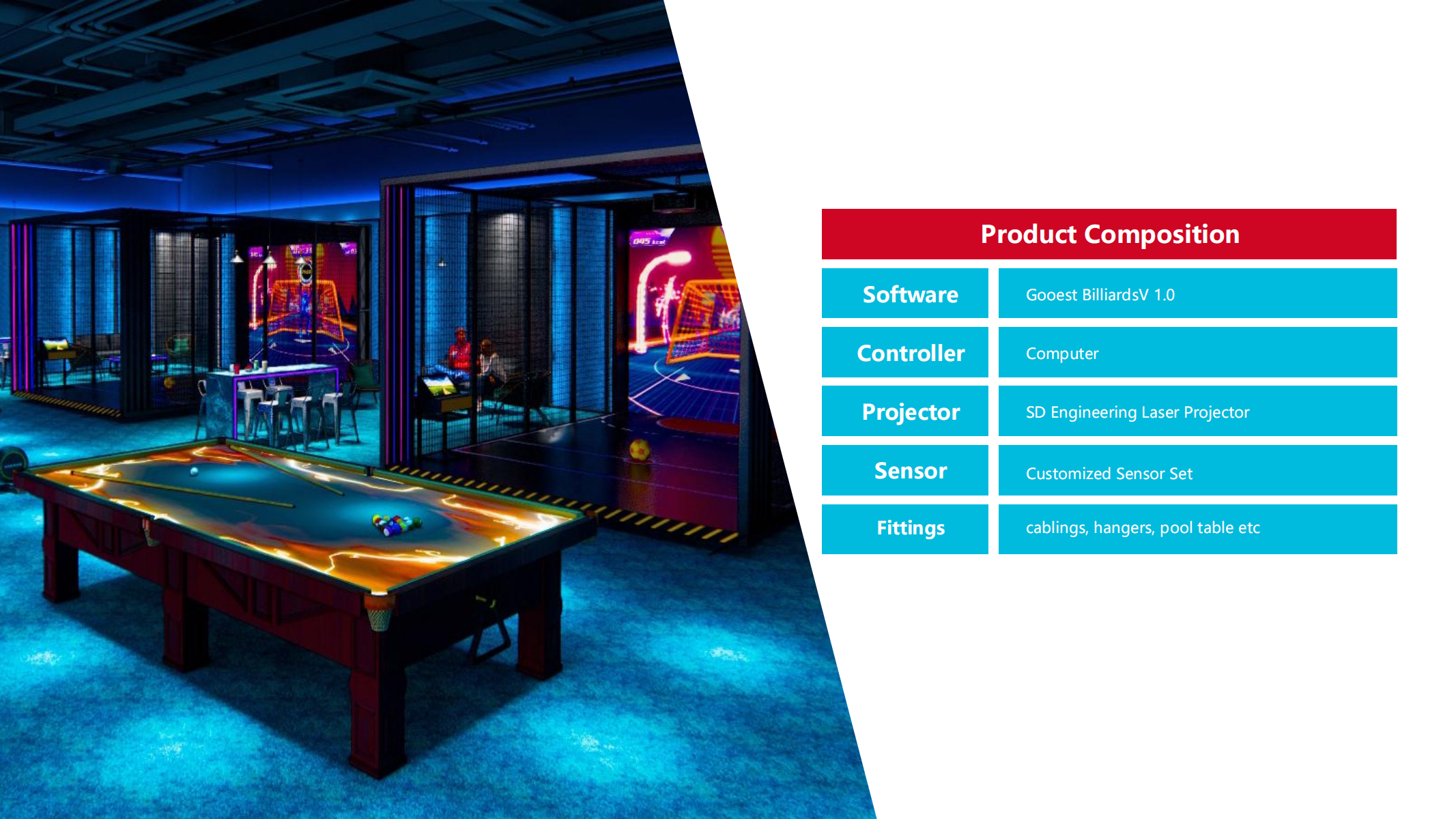 Computer,SDEngineeringLaserProjector,Customized Sensor Set,cablings,hangers,pool table etc |